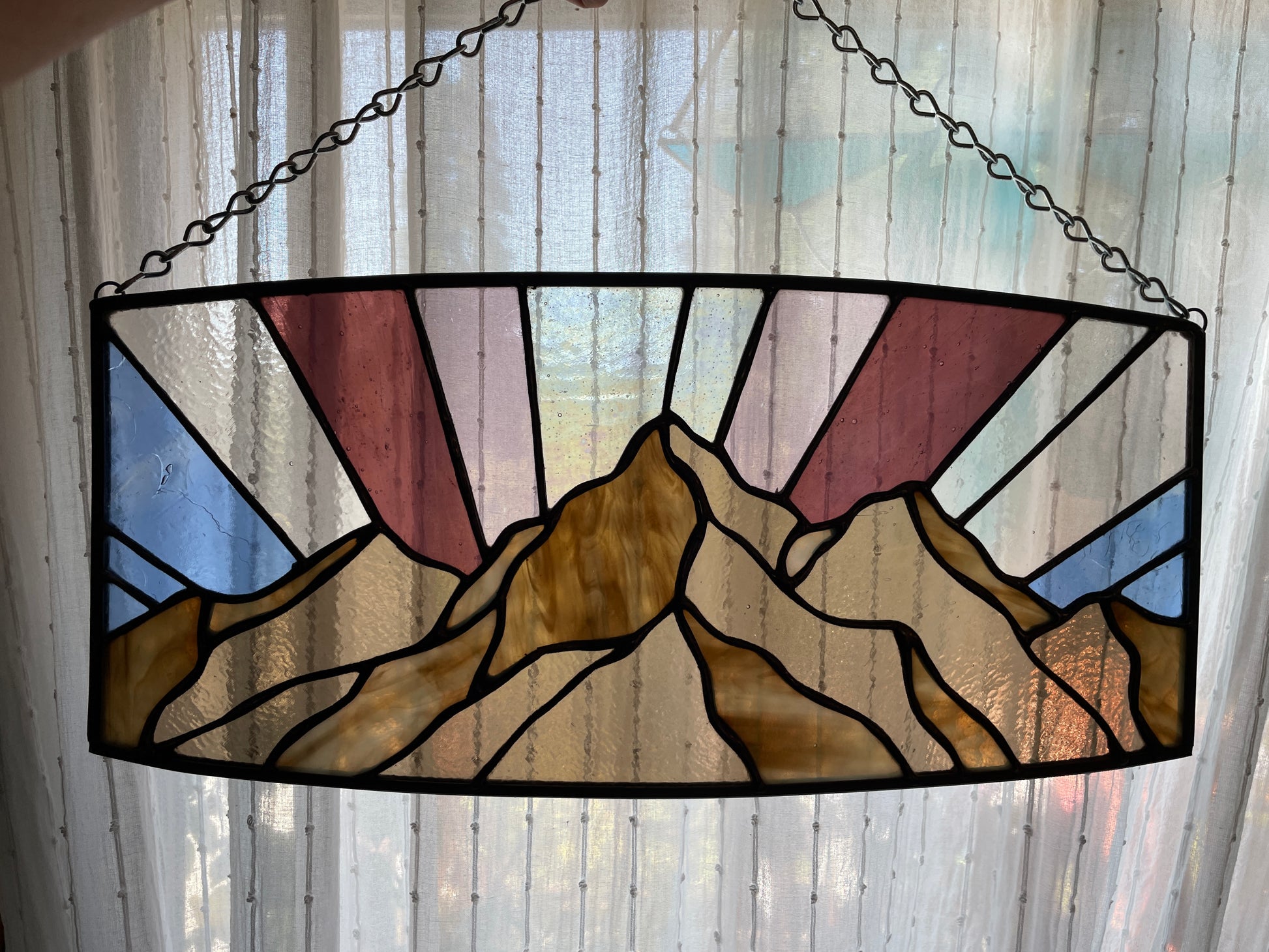 This stained glass suncatcher was lovingly crafted by Robyn Sparkles Glass. Each piece of glass (some very rare!) was carefully chosen to depict the glorious essence of a twilight over a mountain range.